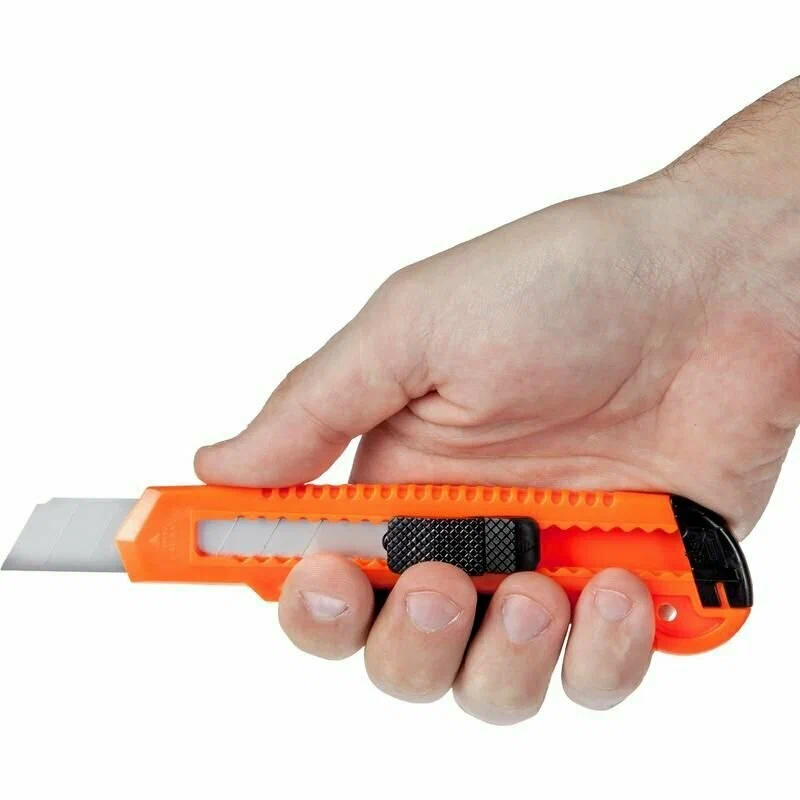 Он оснащён эргономичной рукояткой и острым сегментированным лезвием, ширина которого – 18 мм, а толщина – 0.5 мм. Такой инструмент без труда справляется с различными материалами. Корпус канцелярского ножа выполнен из пластика. Материал лезвия – сталь. Нож канцелярский строительный отличается высокой прочностью. Поэтому он будет долгое время радовать в работе. Кроме того, у ножа есть механизм фиксации лезвия, тип – защелка. Он позволяет без труда отрегулировать длину режущей части и надёжно закрепить её положение. Инструмент отлично подходит, например, для резки бумаги, распечатывания корреспонденции и посылок. Меры предосторожности:– при работе с лезвиями используйте средства защиты;– не утилизируйте лезвия с бытовыми отходами;– хранить в недоступном для детей месте.
