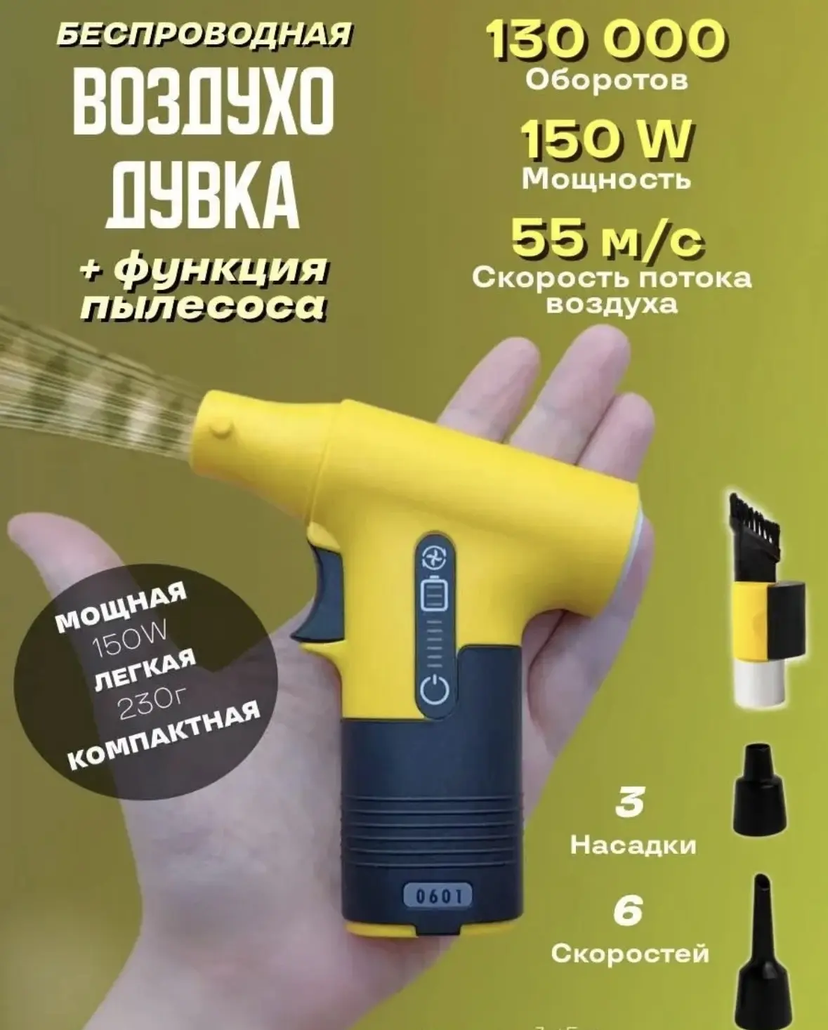 Оснащен высокоскоростным бесщеточным турбодвигателем, скорость которого может достигать 130 000 об/мин, обеспечивая сильную скорость ветра до 55 м/с.