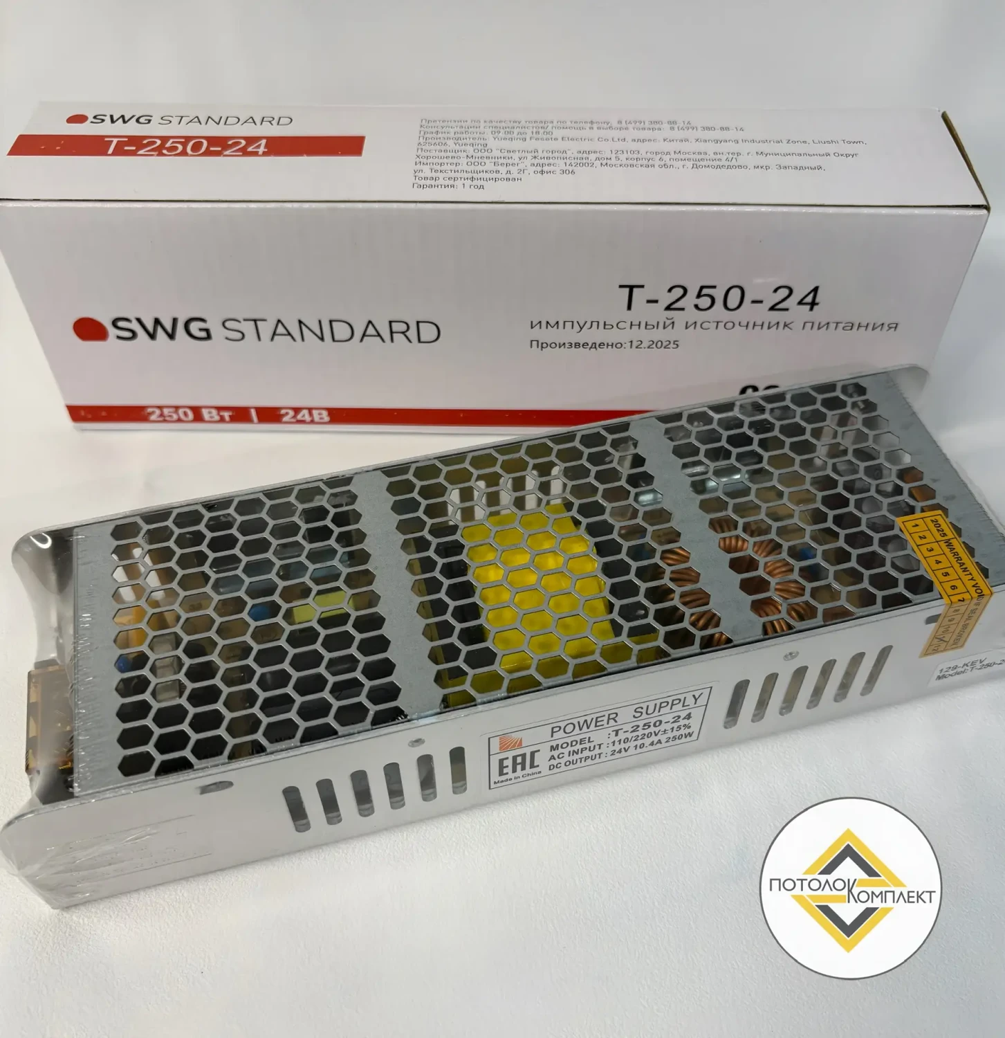 Блок питания SWG Standard серии T — компактный (узкий) открытый источник питания для светодиодных лент с выходным напряжением 24 В и мощностью 250 Вт. Формат IP20 рассчитан на установку в сухих помещениях, где нет прямого попадания влаги и пыли.