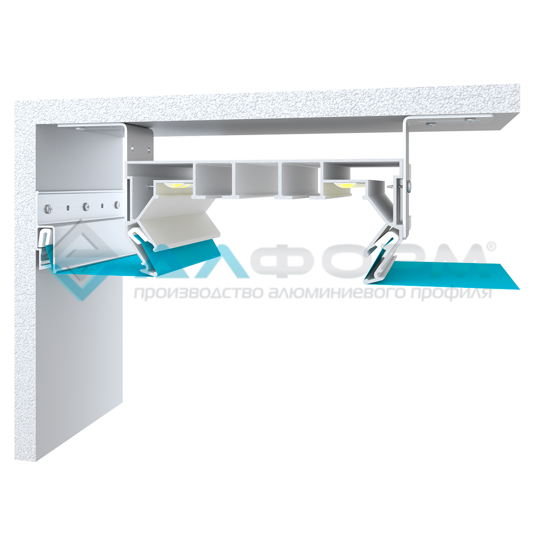 Профиль для изготовления ниш под карниз потолочного крепления с местом крепления штор с подсветкой.
