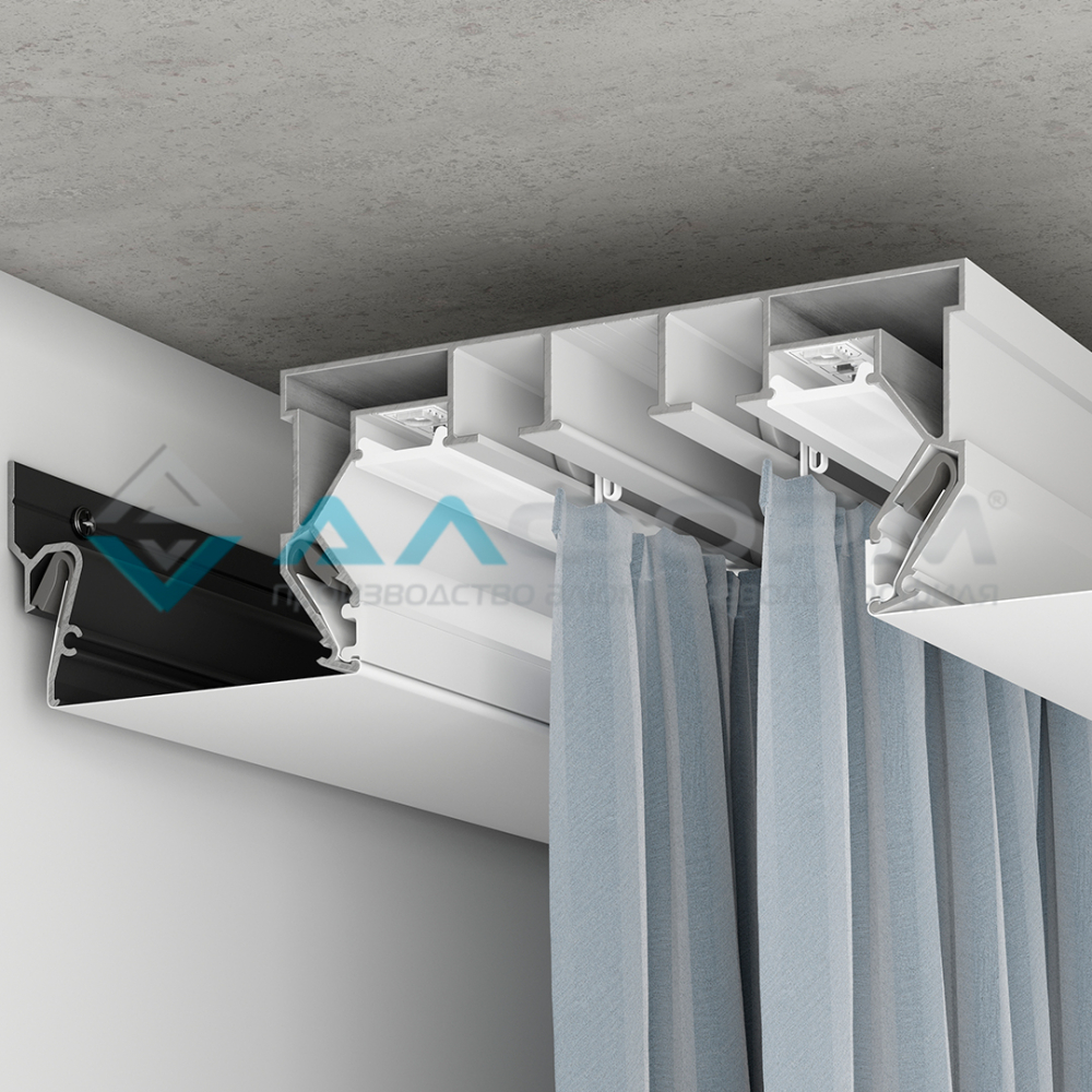 - Конструкция профиля предусматривает два ряда для крепления штор, что делает его особенно удобным для комбинированных композиций — например, тюля и портьер.